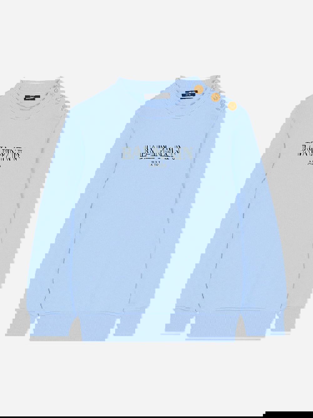 Balmain Kids Logo Sweatshirt in blue with a Balmain Paris border. Made from 100% organic cotton, this long-sleeved style has a round neck and ribbed trims for a clean, structured finish. A Balmain sweatshirt for boys with clear branding and a simple silhouette.