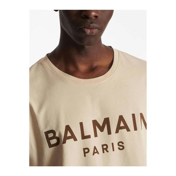 Logo-print detail T-shirt from Balmain featuring Brown text on a cotton t-shirt with logo print to the front, round neck, short sleeves and straight hem