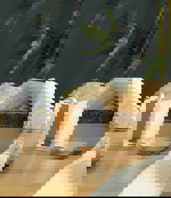 The unsealed light wood bamboo lid offers simple access and doubles as a coaster for resting the candle between uses. The scent opens with bergamot, settles into white musk at the heart, and finishes with a cedarwood base for a warm, clean impression.