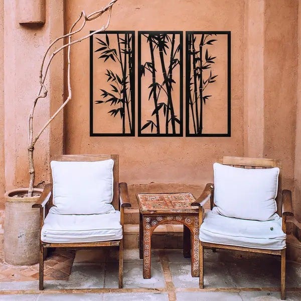 Transform your space with our Bamboo Three Piece Panel Metal Wall Art, designed to evoke the serenity of eastern-inspired gardens. Featuring a modern, minimalist silhouette of bamboo shoots, this set includes three coordinated panels perfect for enhancing indoor rooms or outdoor walls.