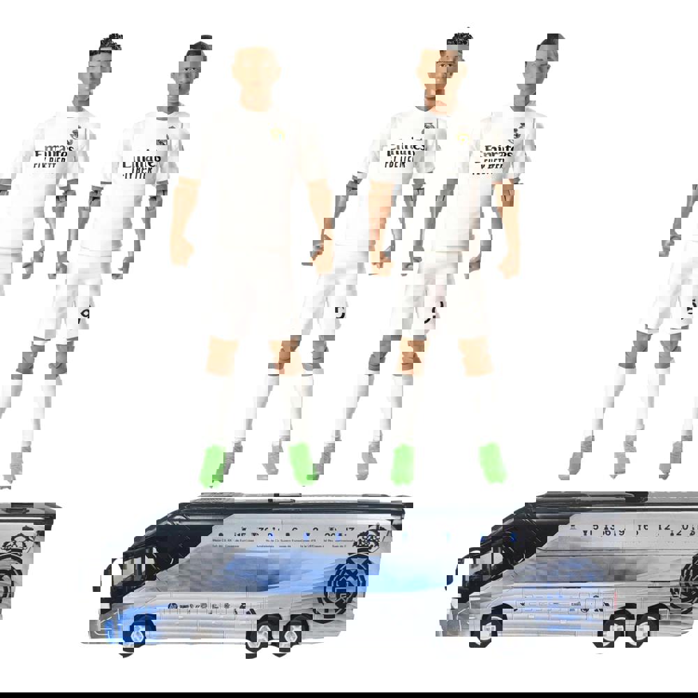 From Banbo, the Mbappe, Bellingham and Real Madrid Bus Bundle brings together three Real Madrid-themed collectibles designed for display, collecting or imaginative play. Featuring two fully articulated 20cm figurines and a detailed team coach toy bus model, it offers a varied way to celebrate the club and two standout players through miniature form.