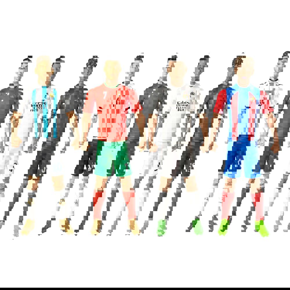 From Banbo, this bundle of fully articulated football Figurines brings together four standout players in one collectible set: Messi (Argentina), Cristiano (Portugal), Mbappe (Real Madrid) and Lamine Yamal (FC Barcelona). Each figure stands 20cm tall and is designed with full articulation, making it easy to create dynamic poses for display.