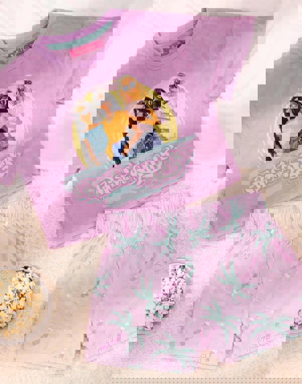 Let them rise and shine in Barbie style with these adorable girls' pyjamas! The sleepwear set comes with a trendy pink cropped t-shirt and shorts that feature "Rise and Shine" graphics with a character print of the stylish Barbie dolls and a palm tree all-over print