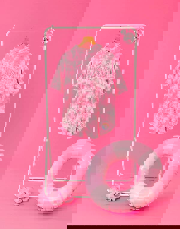 Introducing our new Barbie Poncho Towel for girls, the perfect accessory for your little one's swimming and beach adventures! It comes in a stunning pink and white tie-dye all-over pattern featuring an embroidered Barbie logo and a rise-and-shine badge, making it a must-have for those little Barbie fans.