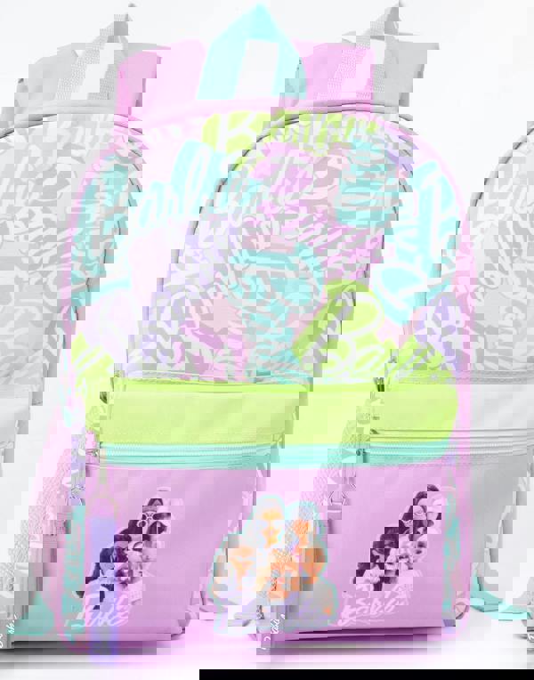 This pastel purple backpack features the iconic fashion dolls posing with a Barbie all-over print, making it the perfect accessory to complete their school day or adventure outfit