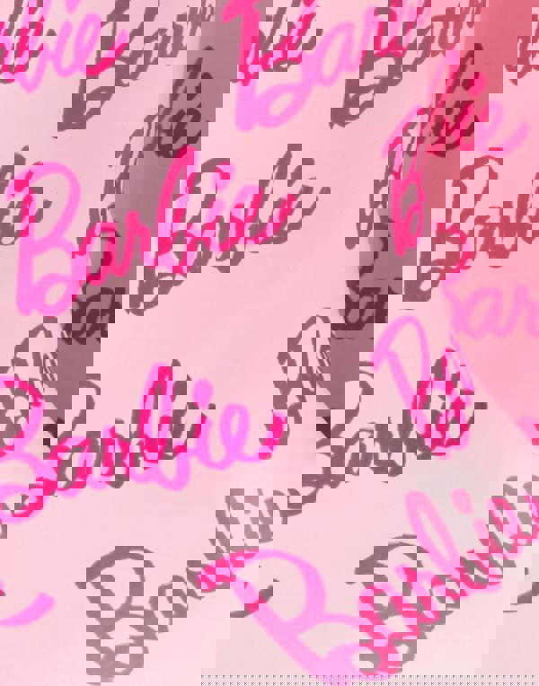 The classic pink colour features a repeated logo design, prominently displaying the Barbie brand, appealing to young fans