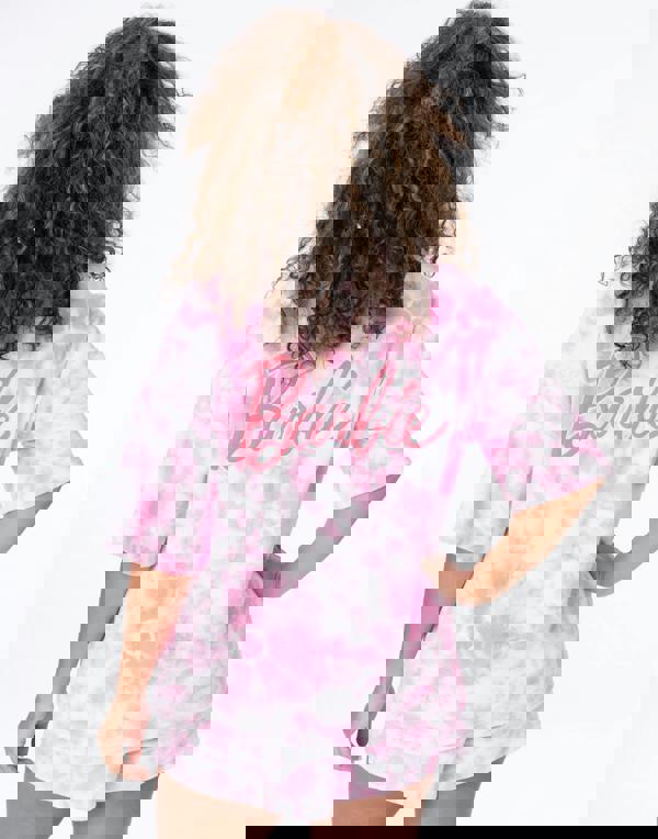 The set comes in a pink tie-dye design with a bright pink embroidered Barbie logo on the shorts and back of the shirt, making it fashionable and trendy.