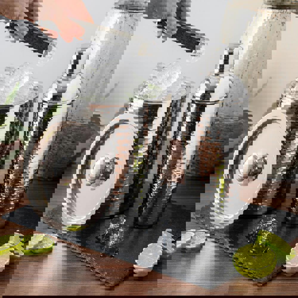Paired with the 700ml hammered cocktail shaker, this set is made for mixing up everything from classic Margaritas and Martinis to your own signature creations. The shaker’s cobbler-style design includes a built-in strainer lid for smooth, mess-free pouring, no extra tools needed. Crafted from rust-resistant stainless steel, it’s as durable as it is striking.