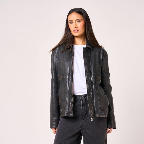 This veg-tanned leather jacket from Barneys Originals features subtle washed detailing. Vintage appeal with a super supple touch. Perfect for combining your curated outfit with a rugged finish. This jacket is a little oversized, with a straight fit which doesn't pull in at the waist. It's a classic "stole my boyfriend's" jacket vibe. On the outside of the jacket you'll find 4 pockets - two zipped, two well.
