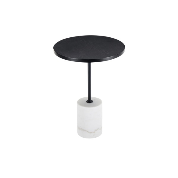 The Basil Lamp Table offers a sleek, contemporary look with a compact, space-saving design. It features a round black MDF top supported by a black cylindrical metal pole, anchored by a white natural marble base. The mix of contrasting materials and finishes creates a refined, modern aesthetic that works perfectly as a lamp table, side table, or decorative accent.