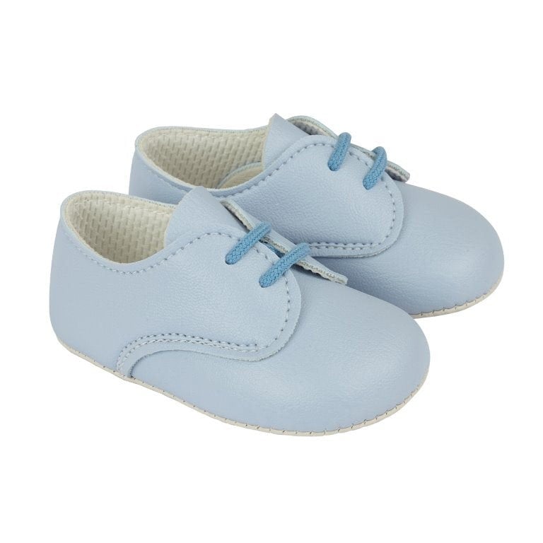 These sky blue pre-walker baby shoes, from our Baypods collection, are made in soft, faux leather and fasten with laces. They have a lightly cushioned insole and their flexible soles are just right for developing feet. .