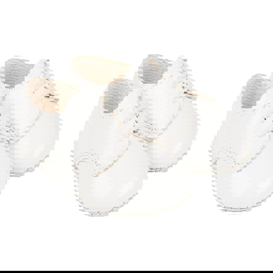 These white pre-walker baby shoes, from our Baypods collection, are made in soft, faux leather and fasten with laces. They have a lightly cushioned insole and their flexible soles are just right for developing feet. .