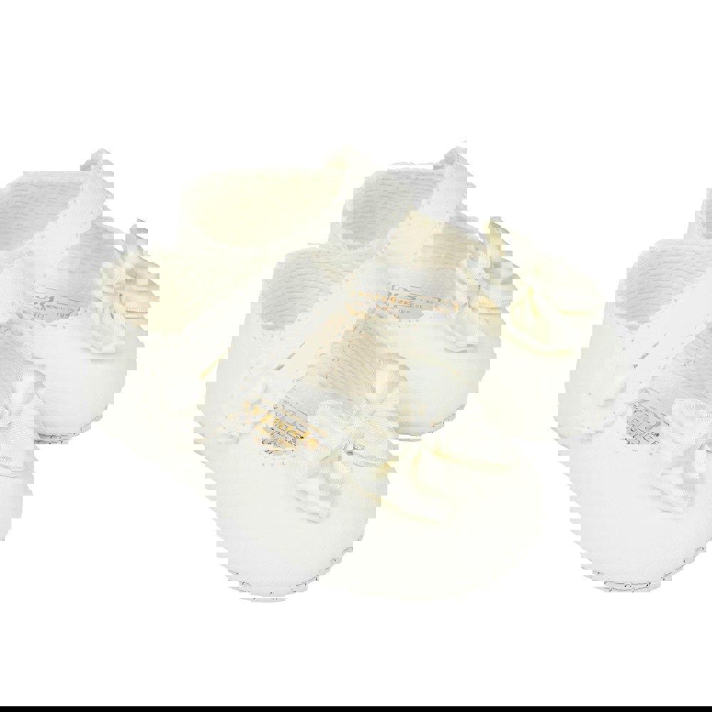 These gorgeous cream pre-walker baby girl shoes, from our Baypods collection, are beautifully made in soft faux matt leather and have pretty satin bows on the toes. Easy to put on, they secure with a button fastening strap. They have a lightly cushioned insole and their flexible soles are just right for developing feet. .