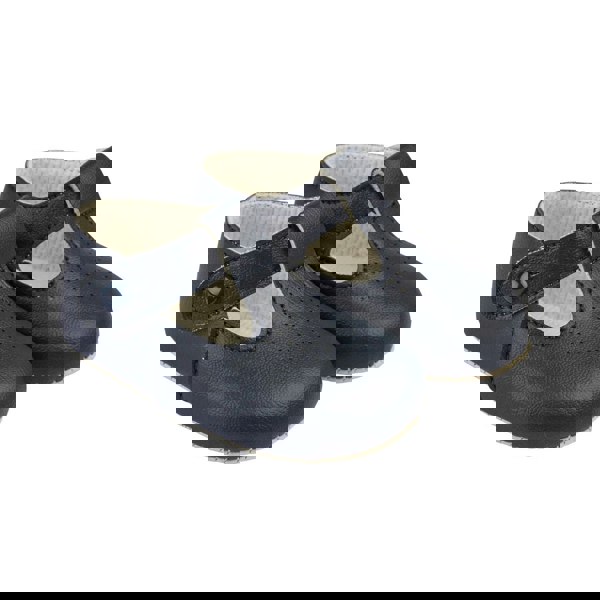 These navy pre-walker baby shoes, from our Baypods collection, are beautifully made in soft faux leather and have a dainty holed pattern on the toes. In a t-bar style, they are easy to put on and secure with a button fastening strap. They have a lightly cushioned insole and their flexible soles are just right for developing feet. .