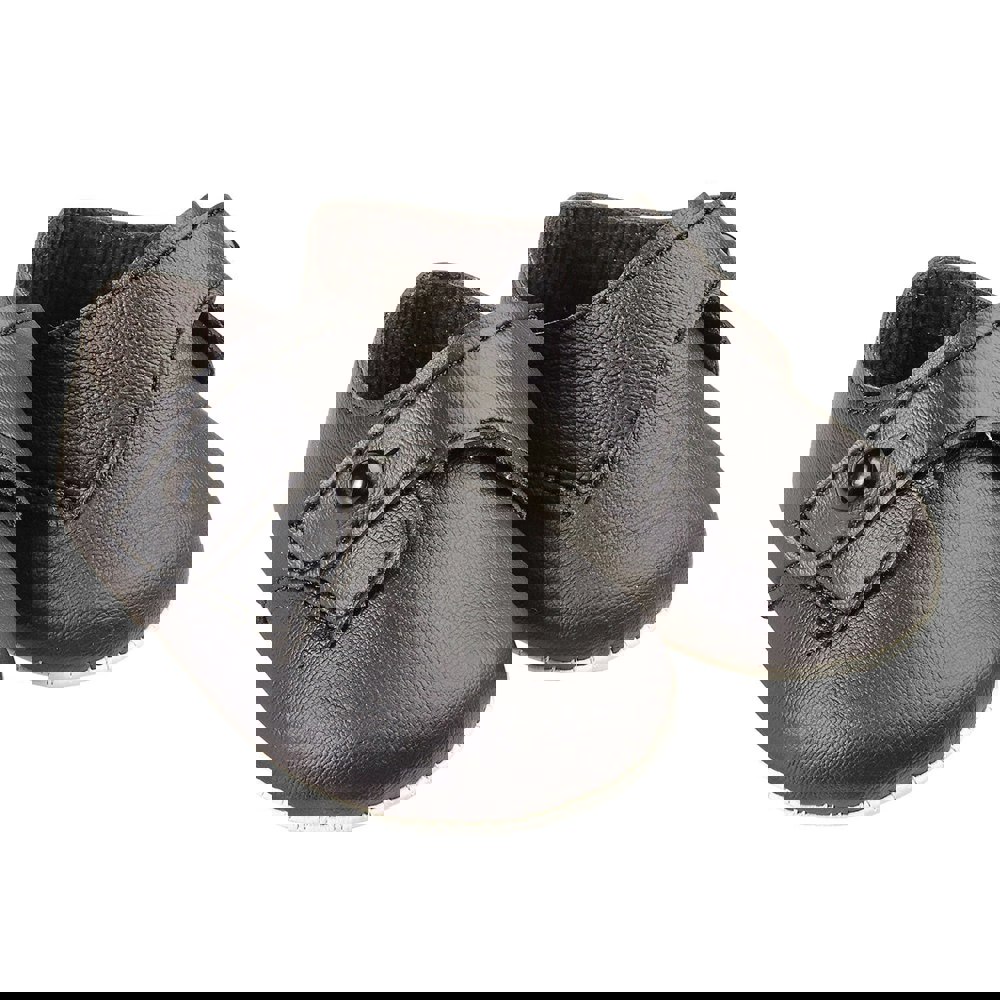 Baypods, black imitation leather, synthetic pre-walker baby shoes with a flexible sole and a comfortable lightly padded insole. Made in England, this classic style with a button fastening is perfect for when a traditional look is required. .