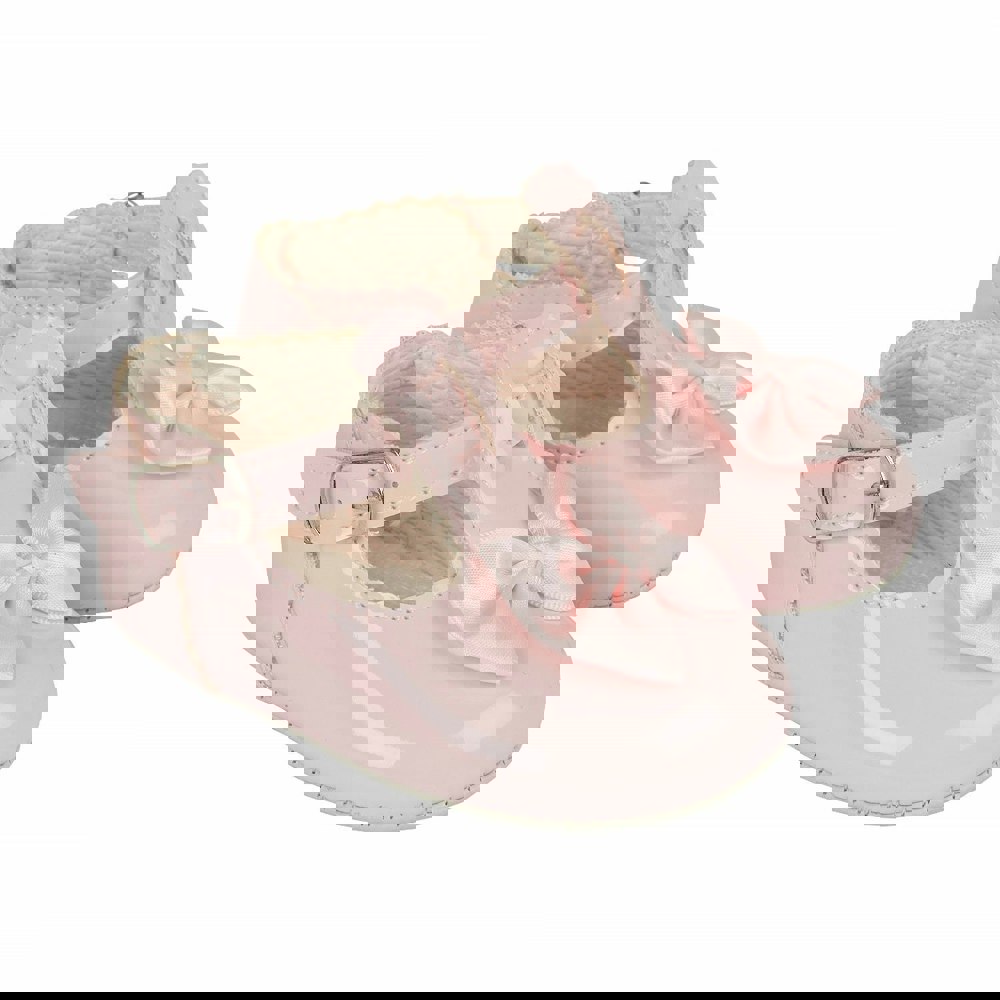 These gorgeous pink patent pre-walker baby girl shoes, from our Baypods collection, are beautifully made in soft faux patent leather with a classic t-bar style, scalloped edging and have pretty satin bows on the toes. Easy to put on, they secure with a button fastening strap. They have a lightly cushioned insole and their flexible soles are just right for developing feet. .