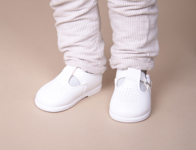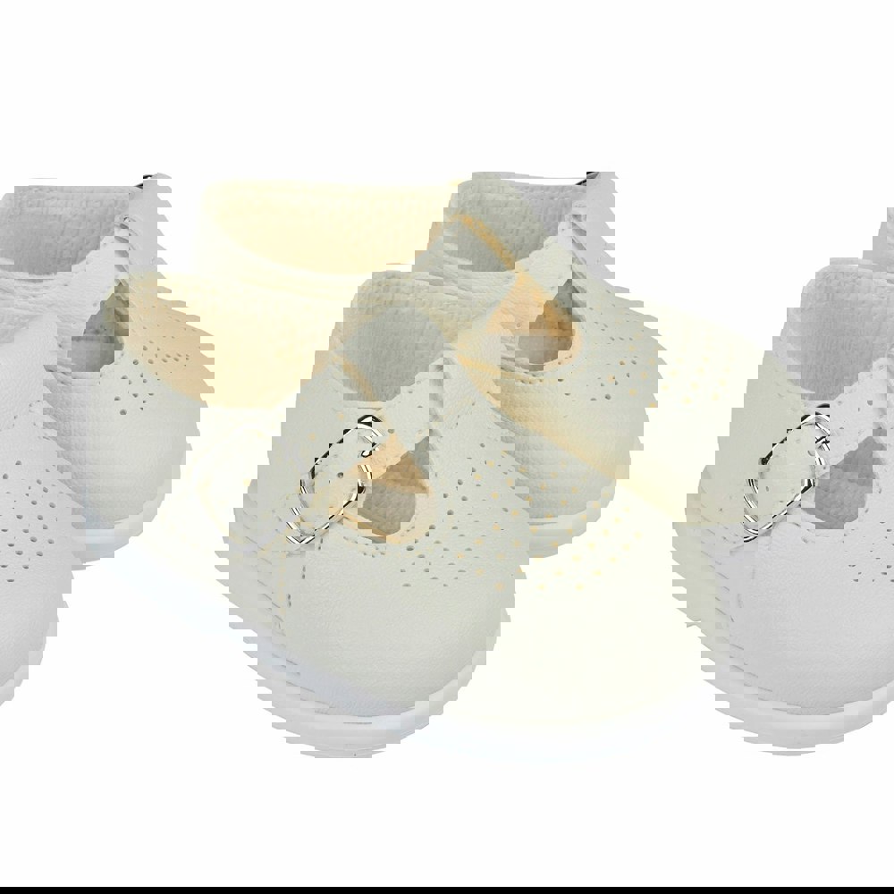 Cream faux leather 'Baypods' first walker shoes. Made in England, these smart, traditionally styled shoes are the perfect choice for babies and toddlers. They have buckle fastening straps to keep securely on little feet and rounded shaped toes for correct foot development. .