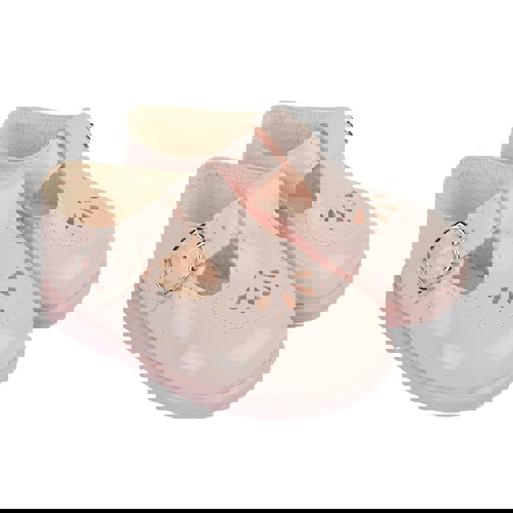 Patent pink faux leather 'Baypods' first walker shoes. These smart, traditionally styled shoes are the perfect choice for babies and toddlers. Featuring buckle fastening straps to keep securely on little feet and a classic t-bar style with a pretty cut out pattern, perfect for when a traditional look is required. .
