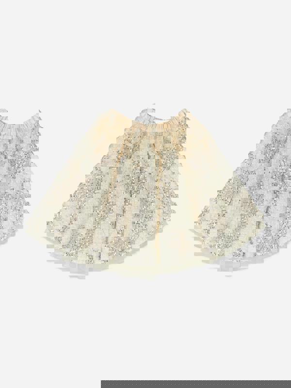 A statement piece for parties and significant events, it brings a decorative look to a young wardrobe while keeping the focus on the skirt’s embellished surface and seasonal styling.