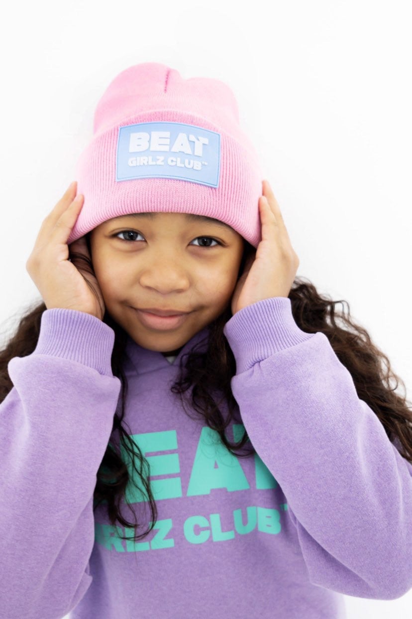 Finish your look with a Logo knitted beanie hat. In a cool pink colour way with a Beat Girlz Club large statement rubber badge to the front turn up.