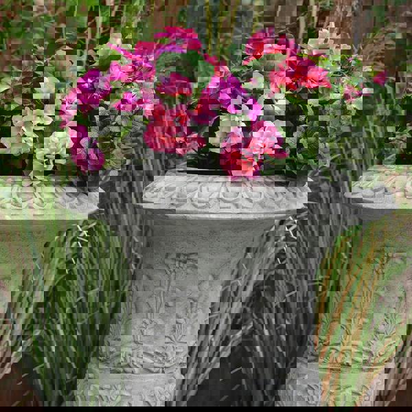 Crafted with an ornate design, this stunning vase has a great aesthetic and is something you will not find anywhere else! This vase really has to be seen in person to appreciate the intricacy of the design that has been compressed into the stone. Finished with an integral base.