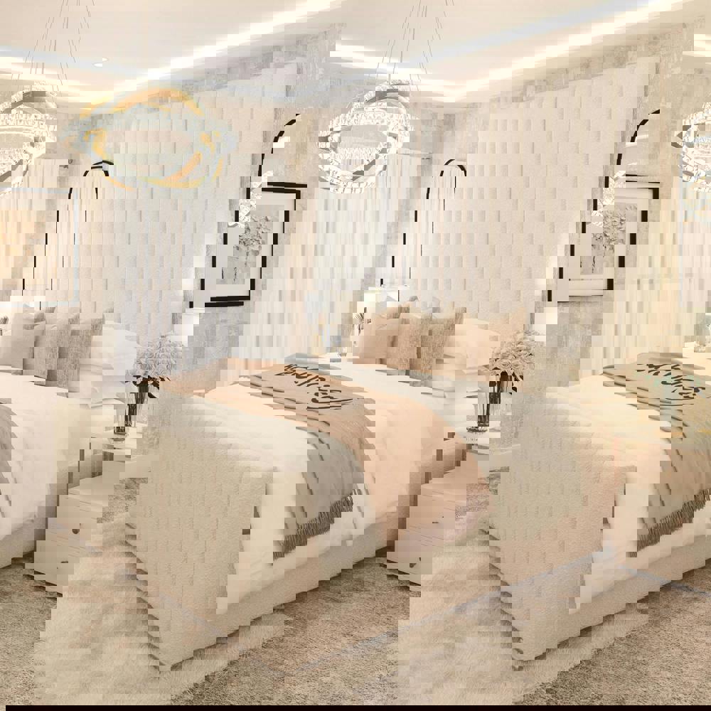 A statement headboard creates a strong focal point, finished with a sleek upholstered edge and panel detailing for a clean, considered feel. The headboard is split into two separate pieces, offering a distinctive, structured look. A coordinating footboard completes the silhouette, balancing the overall design while keeping the profile neat and contemporary.