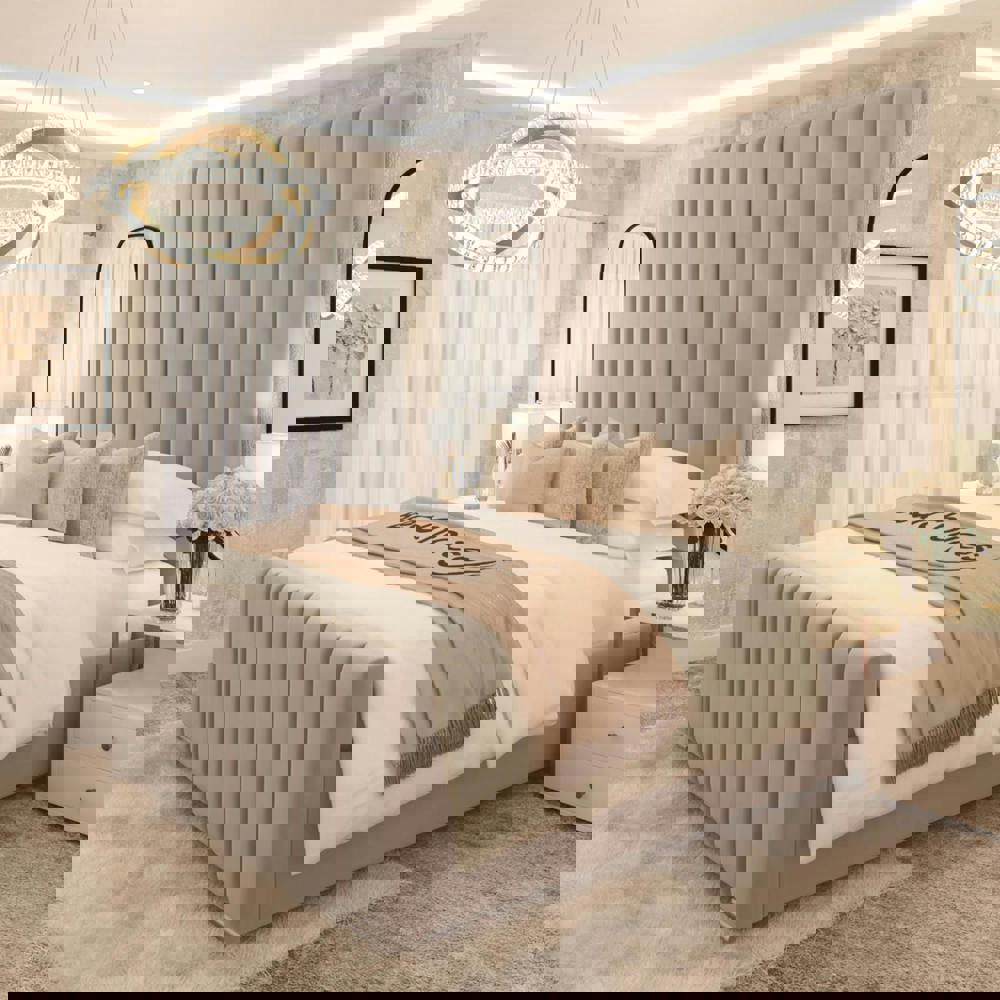 Bring a refined, contemporary finish to your bedroom with the Kensington Luxury Panelled Ottoman 70" Bed Frame with Gas Lift Storage. This upholstered bed frame pairs a stylish headboard with a sleek upholstered edge and panelled finishes, creating a clean, modern look that sits comfortably within a minimalist setting.