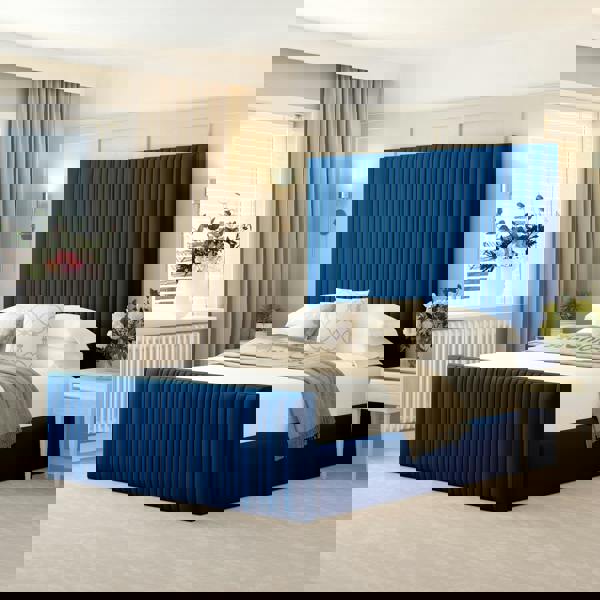 The centerpiece of any chic bedroom, this bed features a strikingly high 70-inch headboard showcasing elegant, deep vertical channel tufting