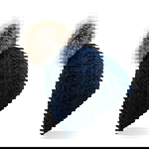 Stylish synthetic rib-knit warm beanie with roll over cuff and crowned with a fashionable faux fur detachable pom pom. Rib knit structure.
