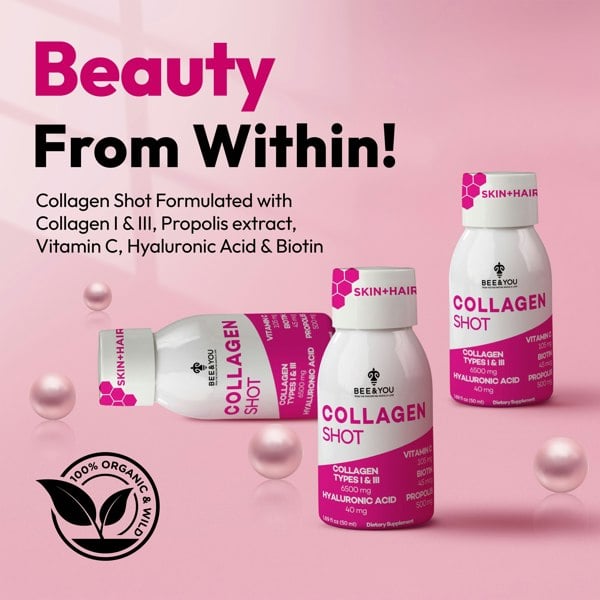 Support your beauty naturally with a great tasting BEE&YOU liquid collagen shot! Formulated with Hydrolyzed bovine collagen (Types I & III), Vitamin C, Hyaluronic Acid, Biotin, Pomegranate juice, strawberry juice, cinnamon, Anatolian propolis extract and honey. Helps