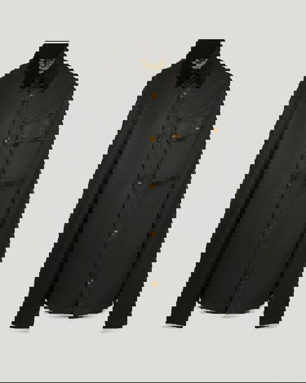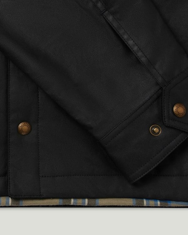 Meet the Ground jacket in black with a stylish corduroy collar. It offers instant warmth and protection with 6oz. British Millerain waxed cotton, which is water and wind repellent. Inside features a cotton twill lining woven in the signature Belstaff checked pattern, angled moto inspired chest pocket and snap adjustable cuffs with antique brass hardware. This men’s jacket is as at home on country walks as it is on the work commute over a suit.