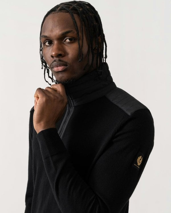 Belstaff's take on a handy quarter-zip jumper is a mixed-media fabrication in soft extra-fine black merino wool with textural nylon quilting. The contrast shoulder panels provide a structural element and military feel to the Kilmington, keeping you warm while commanding attention.