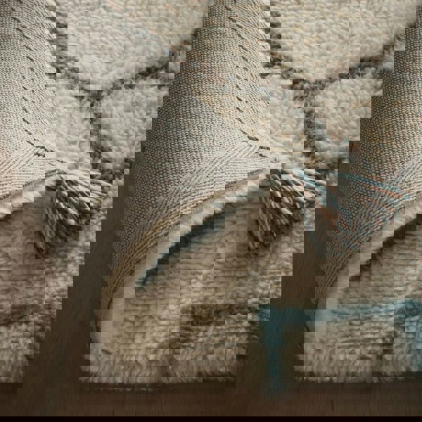 Add texture and warmth to your home with the Berber Knotted Wool Rug. Featuring a geometric diamond pattern in soft grey, rust, and teal on an ivory base, it introduces subtle colour and depth to modern interiors. Finished with tasselled corners, it blends artisanal charm with contemporary elegance.