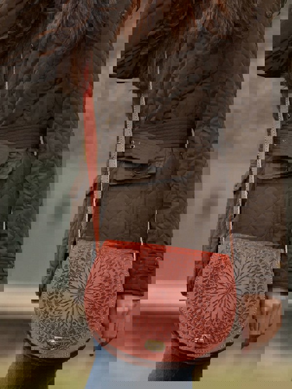 A plain style isn't for everyone, so why not add an eye-catching accessory to your wardrobe with our beautifully embossed saddle bags? With adjustable shoulder strap and two inside compartments this small bag still has space for everything you need to carry from the daytime into the night.