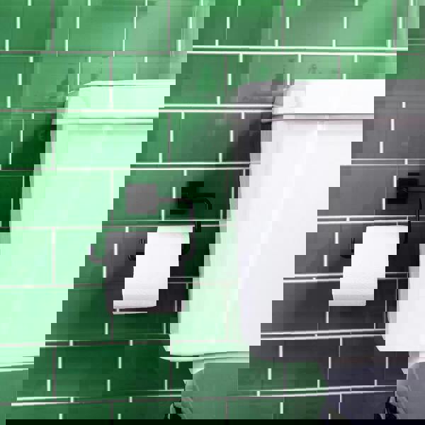 Finished in black, this holder suits a range of bathroom styles and is intended for straightforward placement without the need for drilling, making it a practical choice for bathrooms where you want a simple, adhesive-mounted solution.