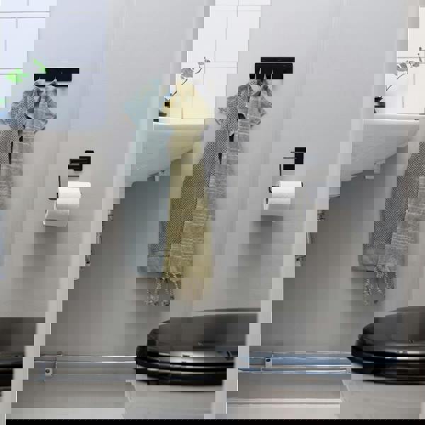 BESLAGSBODEN CUBE Toilet Roll Holder is a self-adhesive Bathroom Toilet Roll Holder designed for wall mounting without drilling. Part of the self-adhesive CUBE bathroom series, it features a cube-shaped backplate and a black surface that combines clean, modern styling with everyday practicality.