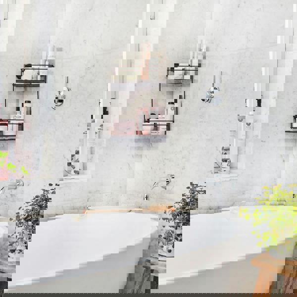 Fitted with a self-adhesive fixing, it is designed for straightforward wall mounting without the need for drilling. Its compact, corner-fitting shape helps keep bottles and accessories neatly contained while maintaining a clean, uncluttered look.