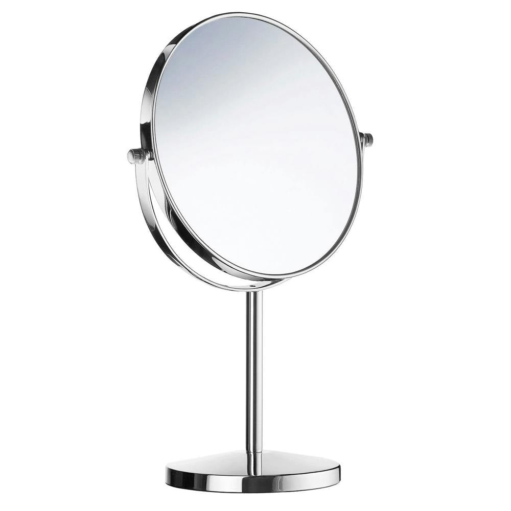 BESLAGSBODEN Polished Chrome Double Sided Mirror is a freestanding make-up mirror designed for everyday grooming, including applying make-up or shaving. Finished in chromed polished metal, it sits on a stable base for convenient placement on a bathroom shelf, vanity or dressing table.
