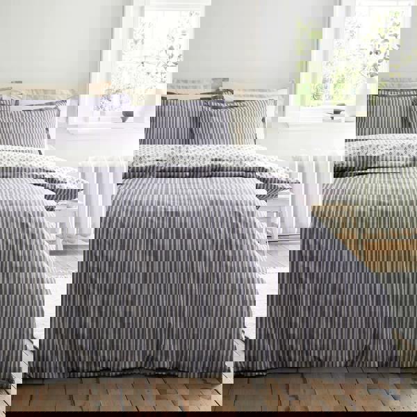 Subtle yet refined, this design blends timeless pattern with gentle texture. Featuring a delicate geometric print in blue tones and a contrasting stripe on the reverse offering effortless versatility. Accented with a fine piped detail with corner pleats, adding a touch of elegance to the design. Dream in blissful comfort under wonderfully soft 200 thread count percale cotton, a beautiful naturally breathable fibre that encourages a better night’s sleep.
