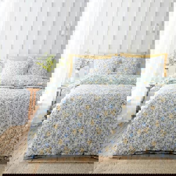 Bring a blend of gentle tones and intricate detailing to your room. Delicate stems and ditsy leaves are interwoven among the beautiful floral blossoms, complemented by a subtle backdrop adding depth and texture to the design. Fully reversible with a contrasting base and finished with delicate flat pipe detail. Experience the softness of premium cotton, in 200 thread count percale, against your skin as you immerse yourself in the tranquil charm.