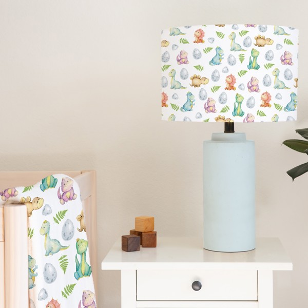 This hand rolled children's bedroom or nursery drum lampshade features the cutest baby dinosaurs on a white background.