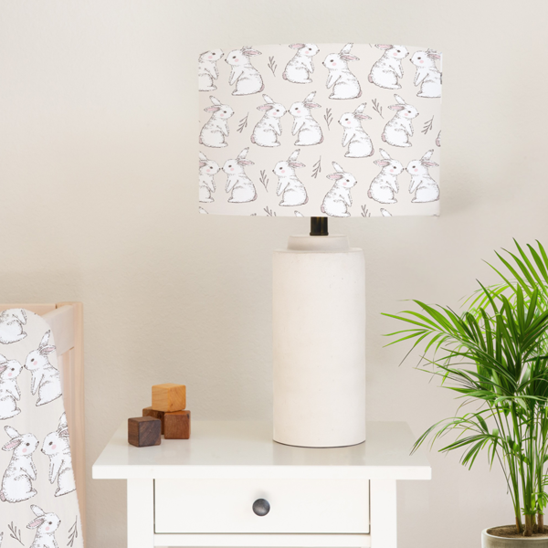 This hand rolled children's bedroom or nursery drum lampshade features sweet little bunny rabbits on a neutral beige background.