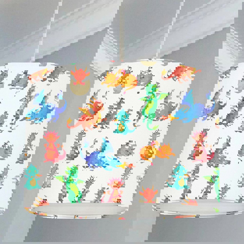 This hand rolled drum lampshade features colourful baby dragons on a white background.