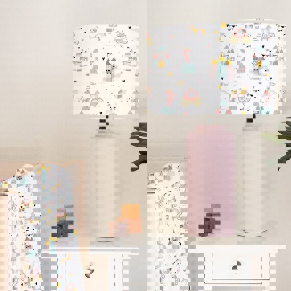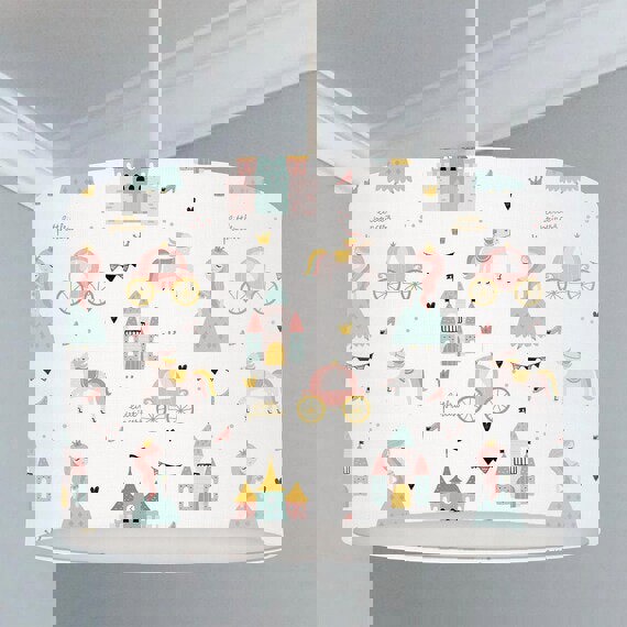 This fun hand rolled drum lampshade features pretty princesses, castles, carriages and horses in pale pinks, golds and mint greens.