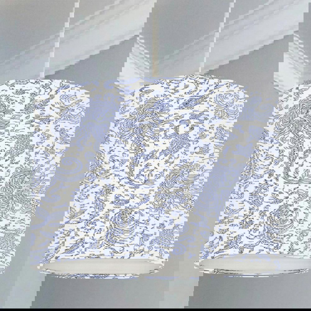 This hand rolled drum lampshade features beautiful blue mermaids on a white background.