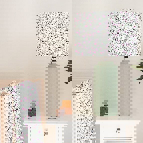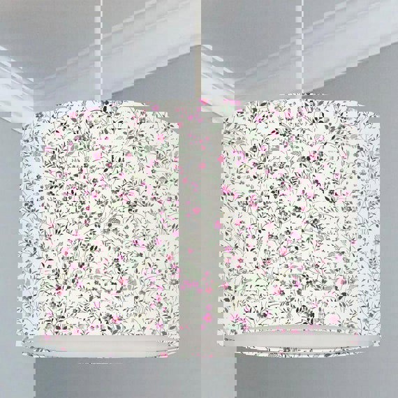 This fun hand rolled drum lampshade features miniature flowers in pinks and greens on a white background.