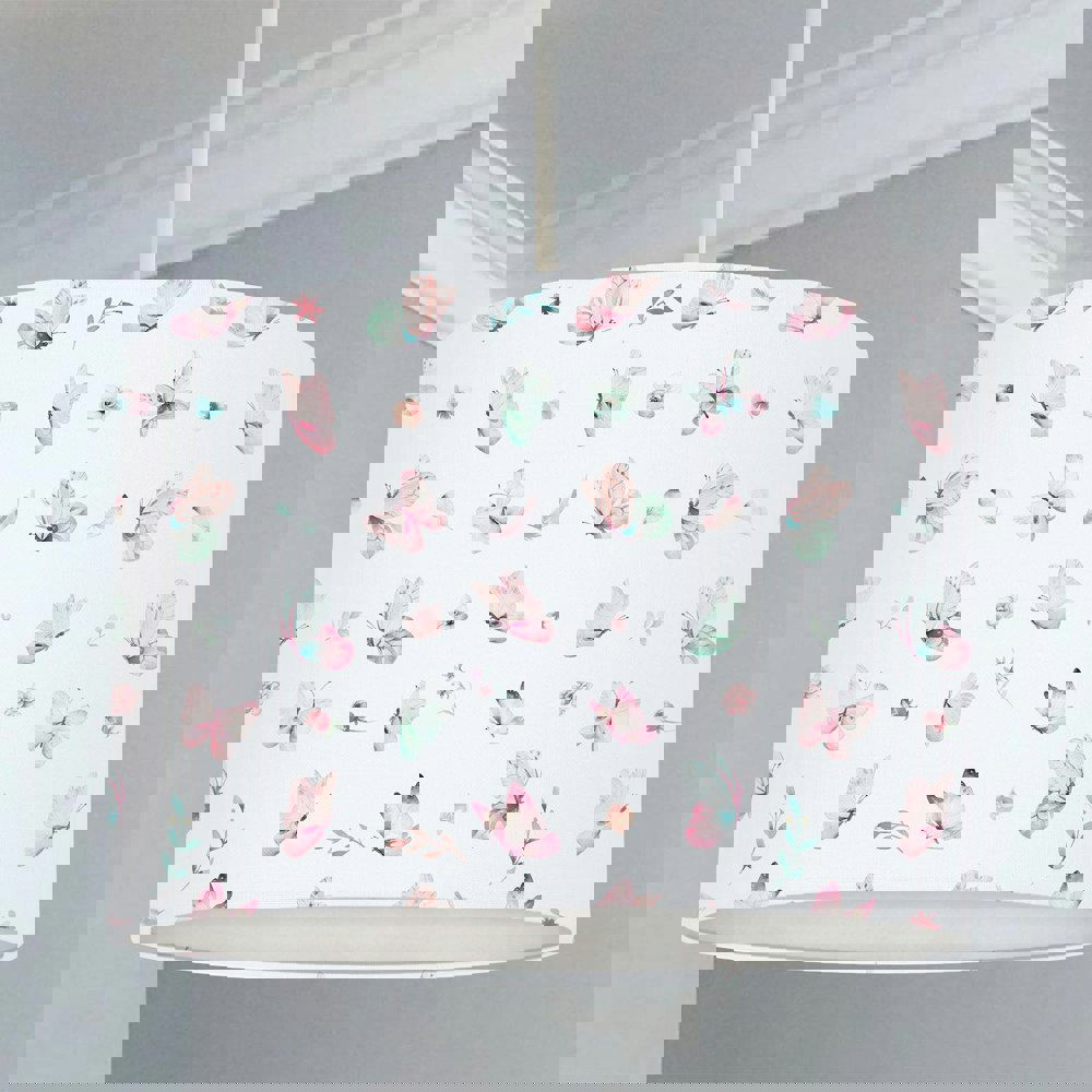This hand rolled children's bedroom or nursery drum lampshade features pink and green butterflies, plant leaves, flowers, and feathers on a white background.