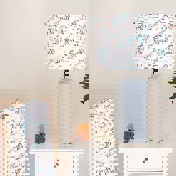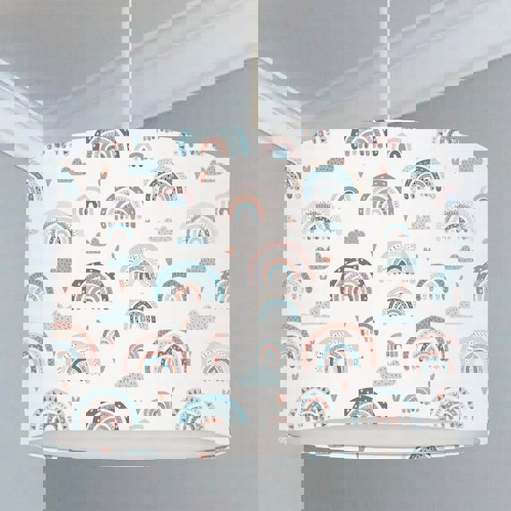 This fun hand rolled drum lampshade features rainbows, clouds and little hearts in soft blues and pinks.