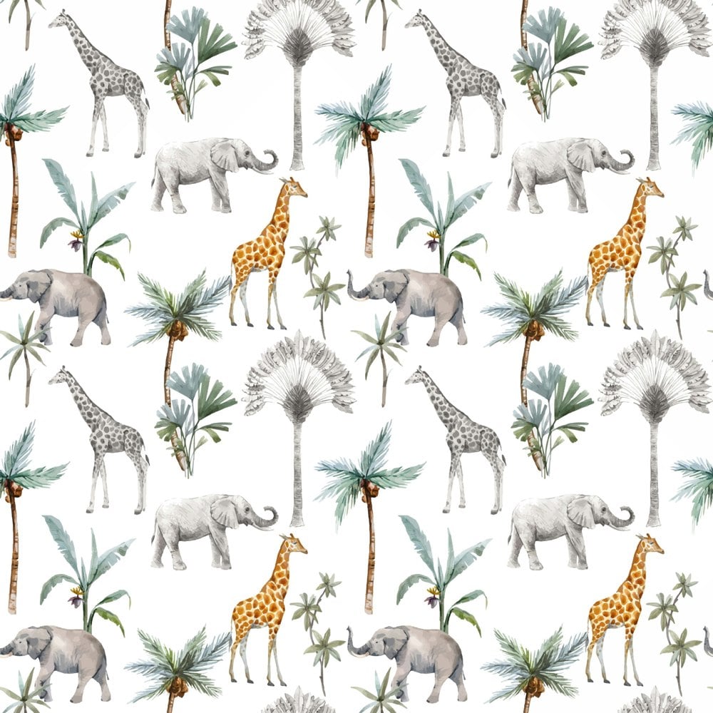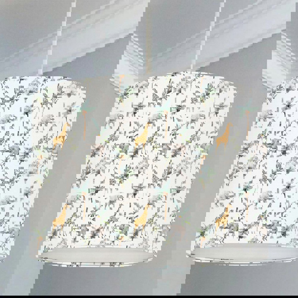 This safari inspired hand rolled drum lampshade features elephants and giraffes on a white background.