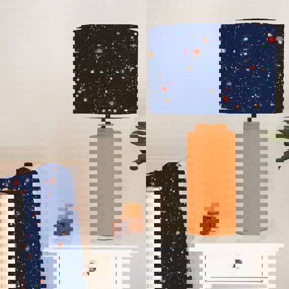 Children's bedroom and nursery lampshade lightshade for ceiling fitting or lamp base featuring a space scene of assorted planets in a solar system in oranges, reds, yellows and greens on a dark blue background.